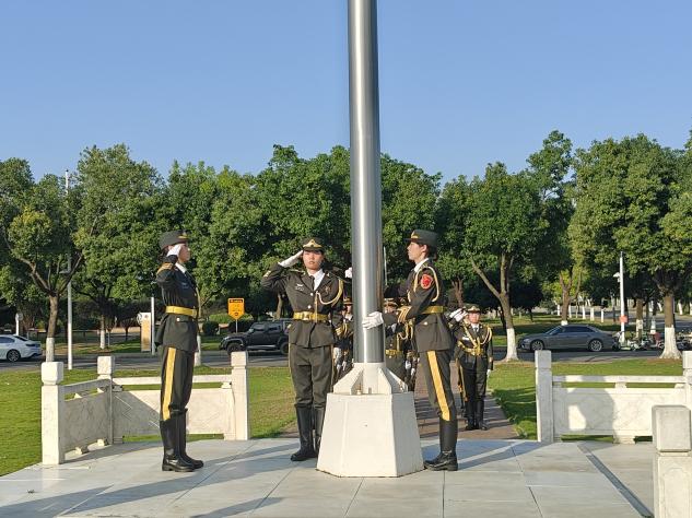 迎着初升的朝阳,鲜红的国旗在国旗护卫队的护送下冉冉升起,神圣而庄严。