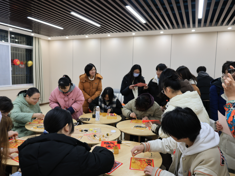 游园会现场年味十足,红灯笼高挂,各式新春标语、窗花贴满四壁。游园会以“福聚一堂签”集五福拉开序幕,每位师生写福字并粘贴到签到墙上进行签到即可领取一张特制的“集福卡”,集齐“智慧”“幸运”“记忆”“践行”“解忧”福,寓意“五福临门”,分别对应“巧思妙想猜灯谜”“好运套圈领奖品”“蛇年知识大挑战”“非遗DIY手工拓印”“拼凑答案之诗”五个游戏。游戏在钱学森学院多个教室同步展开。